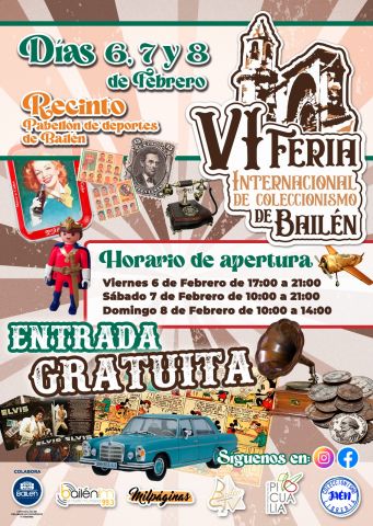 Llega la VI edición de la Feria Internacional de Coleccionismo de Bailén (Jaén). Los próximos días 6, 7 y 8 de febrero, el coleccionismo en España pondrá el foco en la localidad bailenense, donde tendrá lugar este evento, considerado por los coleccionistas como una de las tres mejores ferias a nivel nacional.