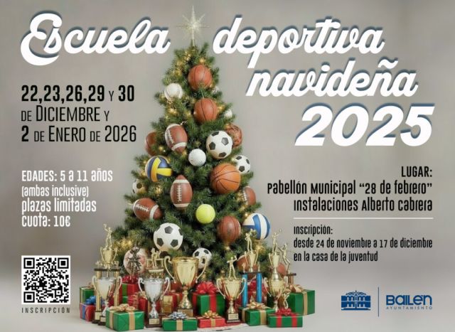Las familias interesadas en apuntar a sus hijos a la Escuela Deportiva Navideña, que cuenta con plaza limitadas y una cuota de 10 euros, podrán hacerlo desde el 24 de noviembre al 17 de diciembre en la Casa de la Juventud, así como consular las bases en el código QR del cartel anunciador. “Consideramos que esta iniciativa es importante para que nuestros niños no dejen de practicar hábitos tan saludables como el deporte aún en días de fiesta, abriendo el abanico de modalidades deportivas para que conozcan otros deportes distintos a los que suelen practicar, en horario de 9.00 a 13.00 horas”, señala Rodríguez.