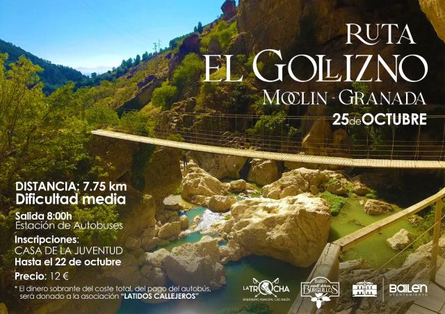 La Concejalía de Deportes, gestionada por Manuel Rodríguez, con la colaboración del Club de Senderismo Municipal ?la Trocha’, ha organizado la ruta ‘El Gollizno’ Moclín-Granada; una iniciativa que tendrá lugar el próximo 25 de octubre y, tal y como ha señalado el edil, “destinada a todos los amantes de este deporte, la naturaleza y la actividad física al aire libre”.