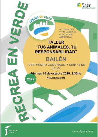 Los centros educativos Pedro Corchado y 19 de Julio acogerán el taller ‘Tus animales, tu responsabilidad’; una iniciativa gratuita promovida por la Diputación Provincial de Jaén, con la colaboración del Área de Medio Ambiente del Ayuntamiento de Bailén, que desarrollará diversas actividades de educación ambiental el próximo 10 de octubre, a partir de las 9.30 horas.
