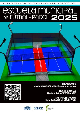 La Escuela Municipal de Fútbol Pádel, organizada por el Área de Deportes del Ayuntamiento de Bailén junto a la Diputación Provincial de Jaén, está destinada a niños y jóvenes nacidos entre los años 2008 y 2018 (ambos inclusive).